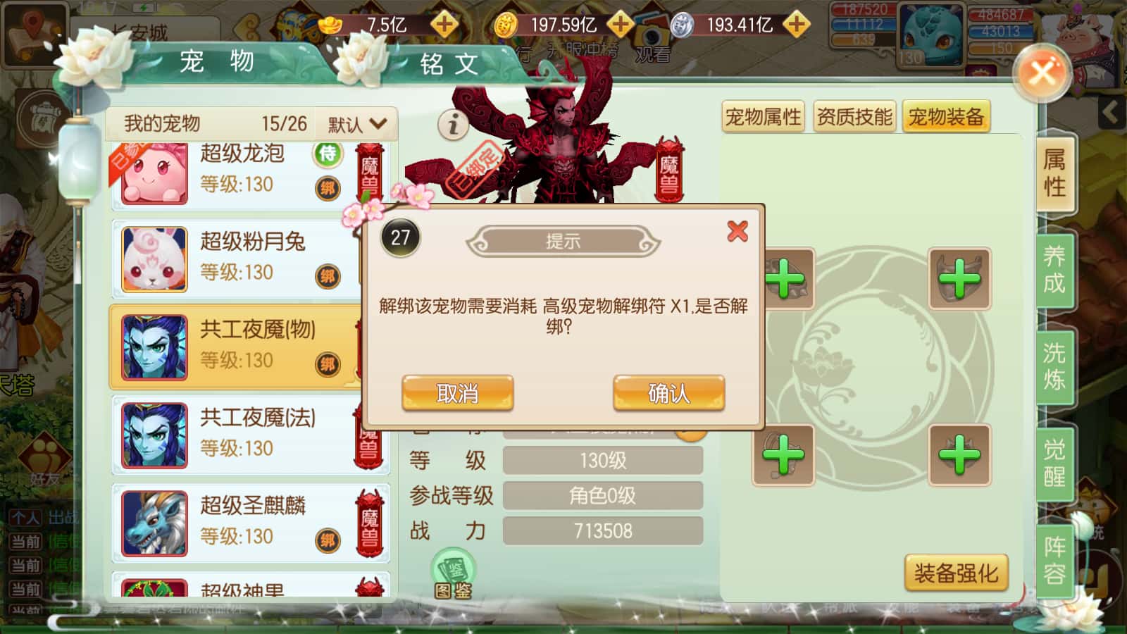 4: 神兽 魔兽 都可用对应的解绑道具解绑,解绑后的宠物可交易