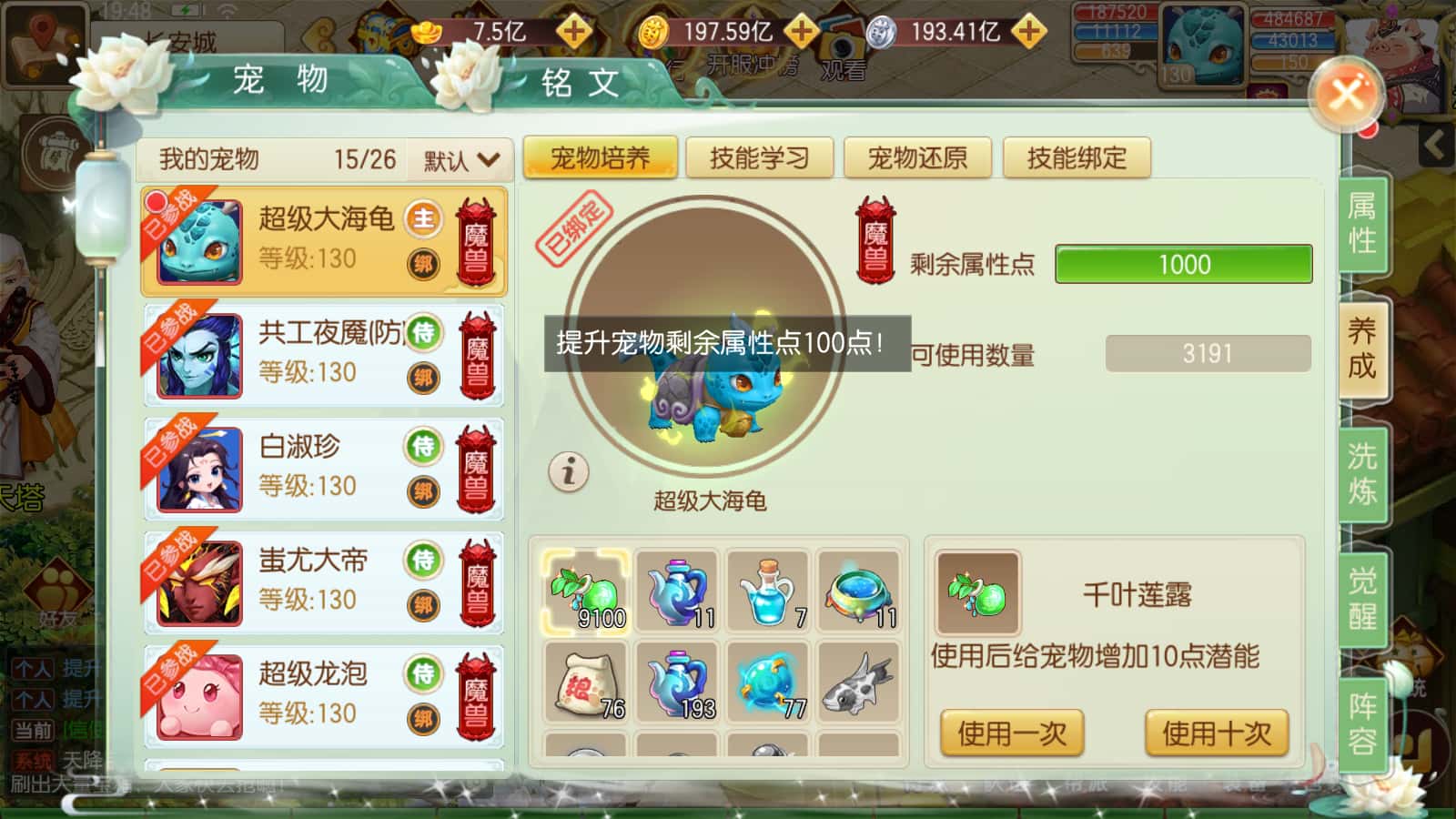 11: 宠物还可通过 千叶莲露 锦鲤 来提升, 都是给宠物增加潜能点的道具,可任意分配