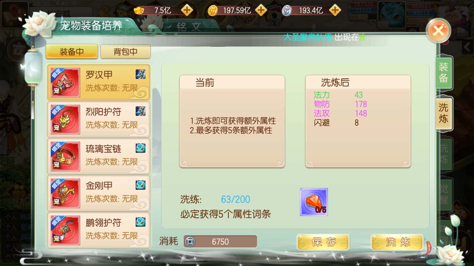 6:宠物突破最高为6星,突破增长的宠物资质,可以通过洗炼 来洗满属性